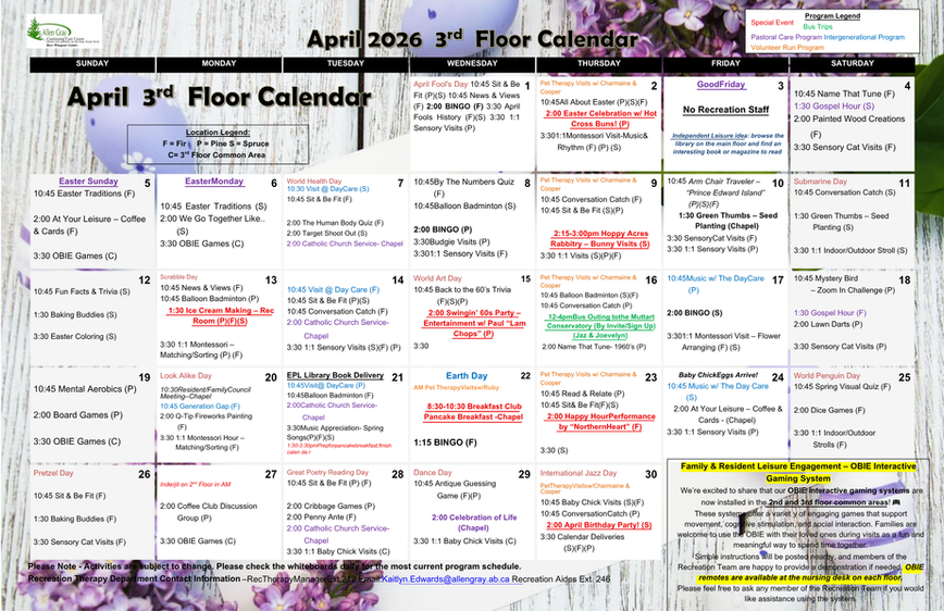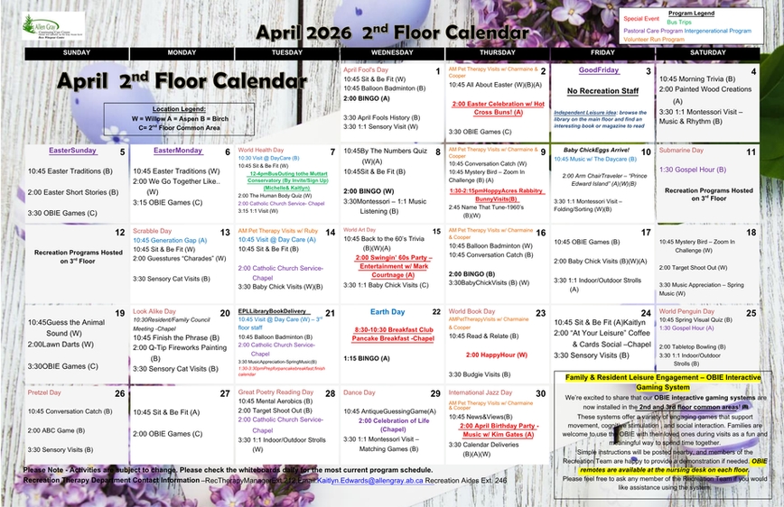 At the Allen Gray Continuing Care Centre, we believe that recreation is an important part of a resident’s life. That’s why we have created a recreation calendar that is specifically tailored to the needs of our Long Term Care Residents.